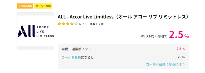 ALL – Accor Live Limitless(オール アコー リブ リミットレス)WEB予約+宿泊で2.5 % (PR)